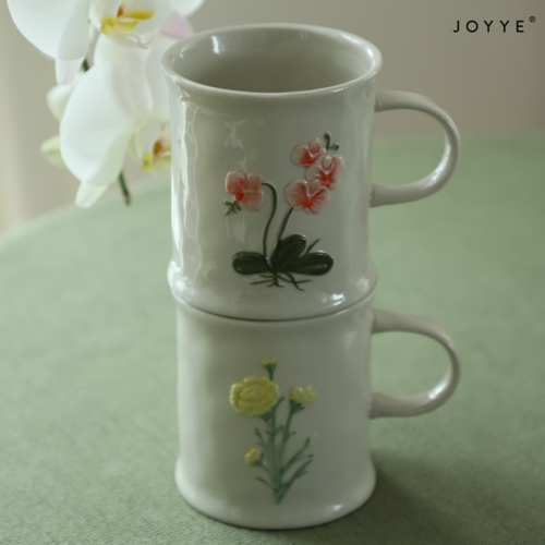 - Designed with a balanced, classic silhouette and finished in a smooth glaze, each mug features delicate embossed floral patterns, hand-painted in light, cheerful tones that brighten any daily routine.