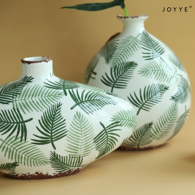 Combined with stamping and crackle glaze, this vase collection displays a quiet vibe through various green leaves for patterns.