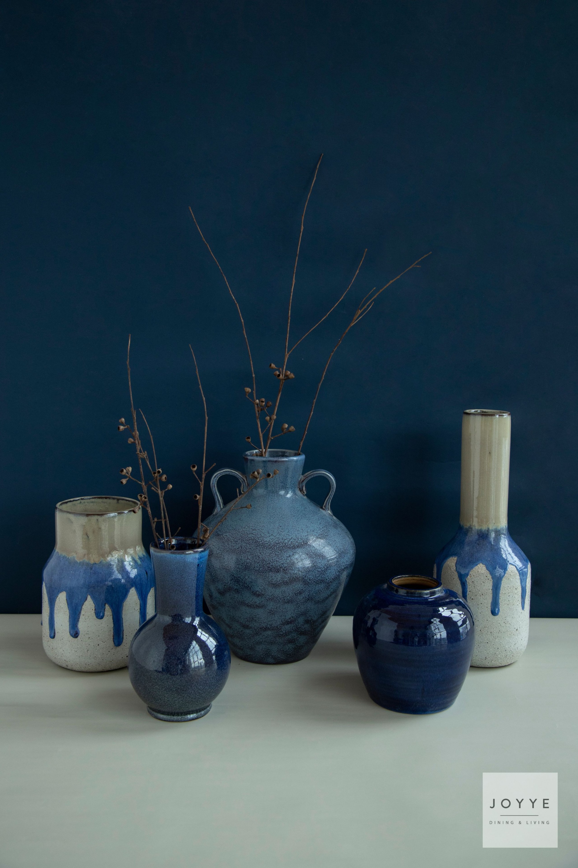 Dream in romantic blue! A vase collection overwhelmed with romantic blue tones, grouping the shiny and matte ones together, dressing up with a hanging glazed design, shaped in kinds of styles, must be an enchanting home decoration idea.