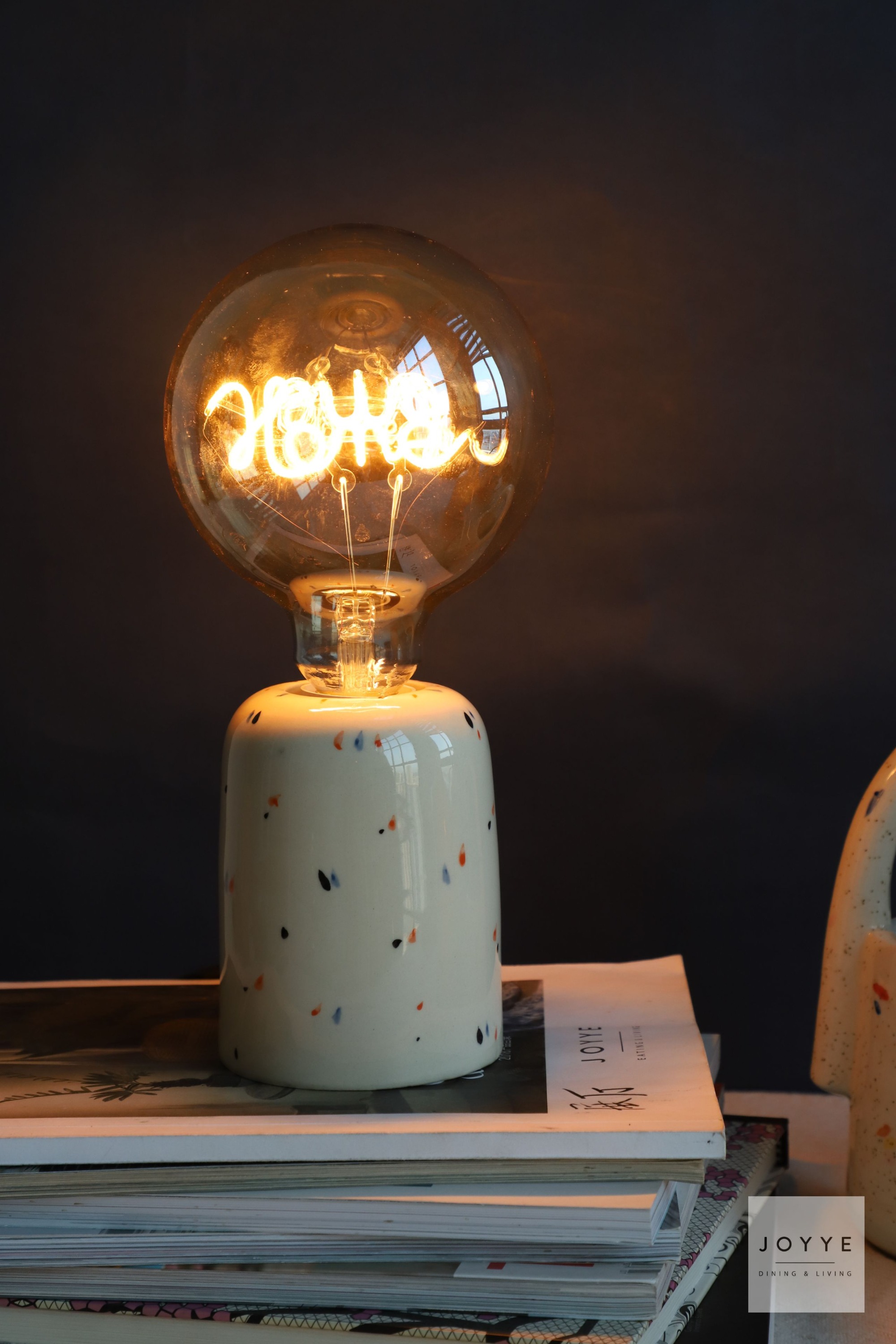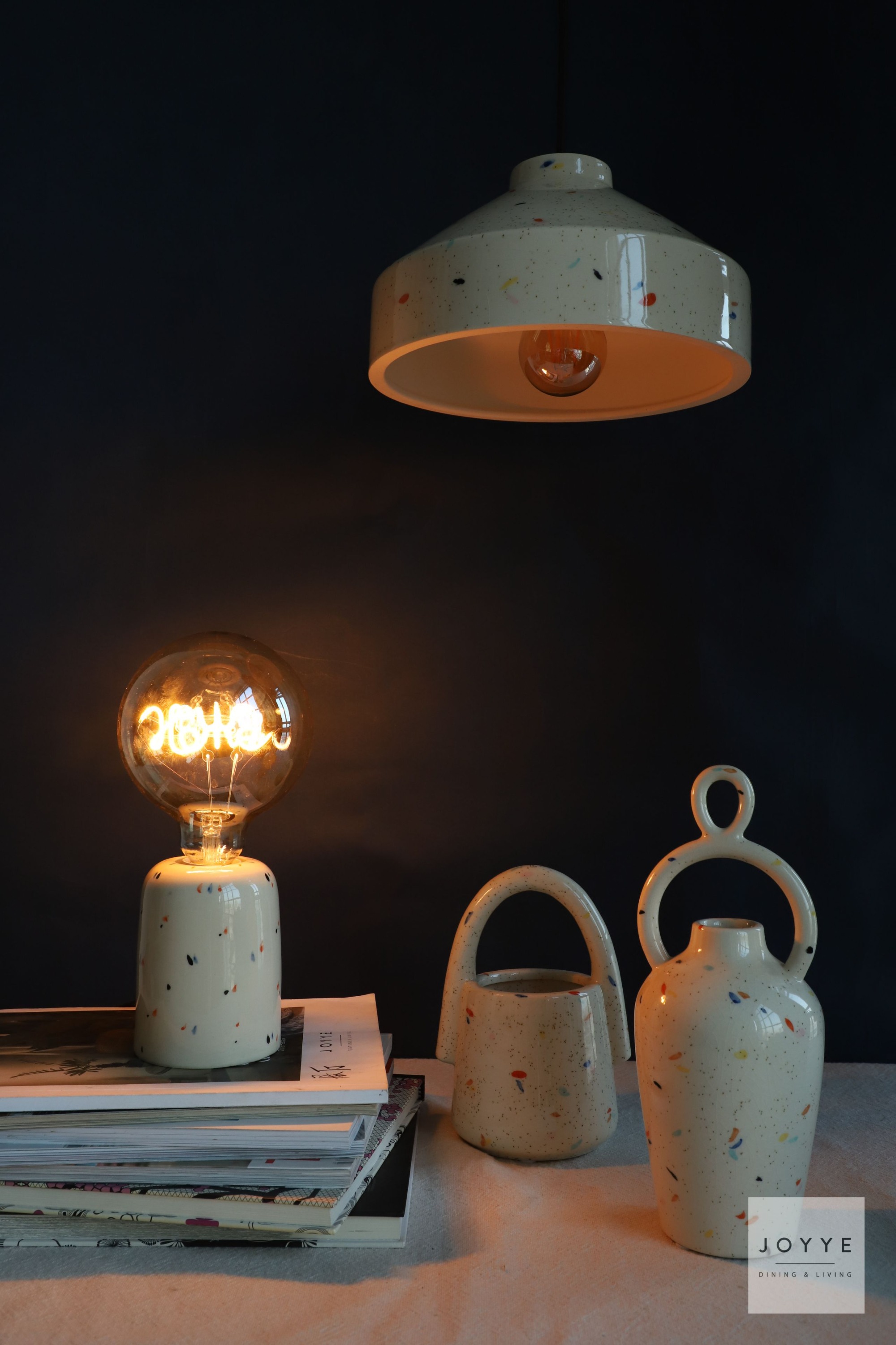 Add a chic accent to your desk or bedside with this modern lamp. With a lovely speckled base and colorful dots smooth finish, this table lamp features a contemporary and artistic look. Crafted of durable ceramic, it is easy to care for and perfect for good-looking table decor.