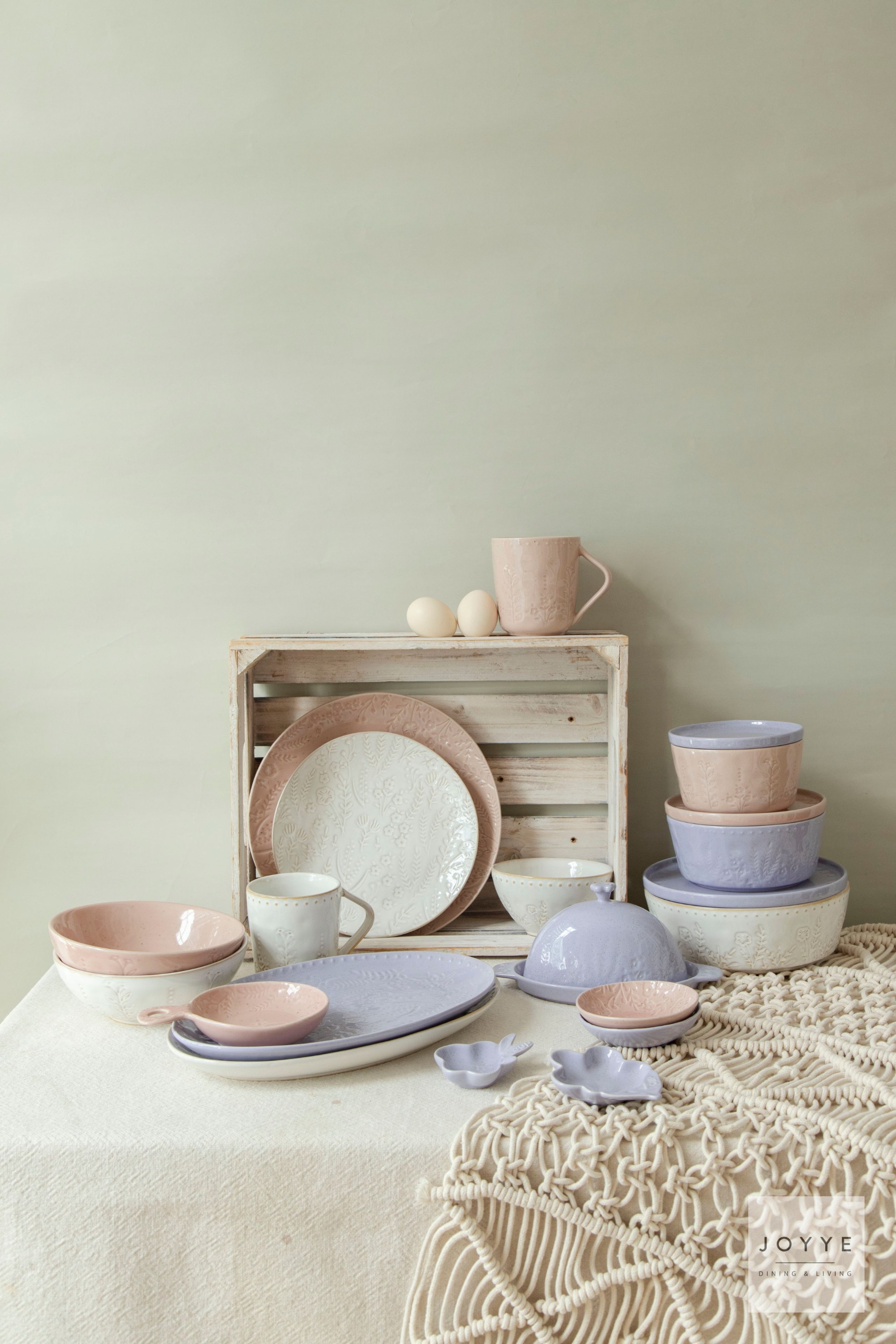 Set up a dreamy table setting at home! Debossed with tiny plants and glazed in soft pink or purple with speckled designs, such a gentle color combination brings this cookware collection a dreamy sense. It is a great piece for a kitchen or dining table setting.
