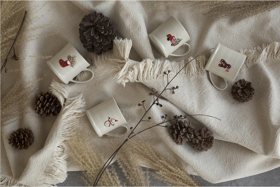 Embossed with snow, Christmas tree leaves patterns, the Snow Man Mug Collection is made of strong stoneware in soft white glaze. The round mug body also brings us a soft touch, providing a warm vibe this Christmas. Various shapes and patterns are available.