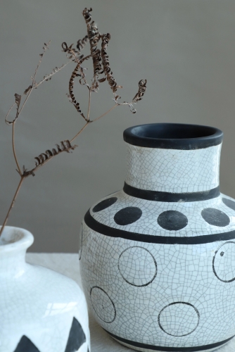 Crackle glaze with hand-painted geometry patterns, just using simple black and white for contrast, this vase collection delivers an essential but mysterious feeling. Let's eyes on shapes, a larger-sized vase is getting trendy.