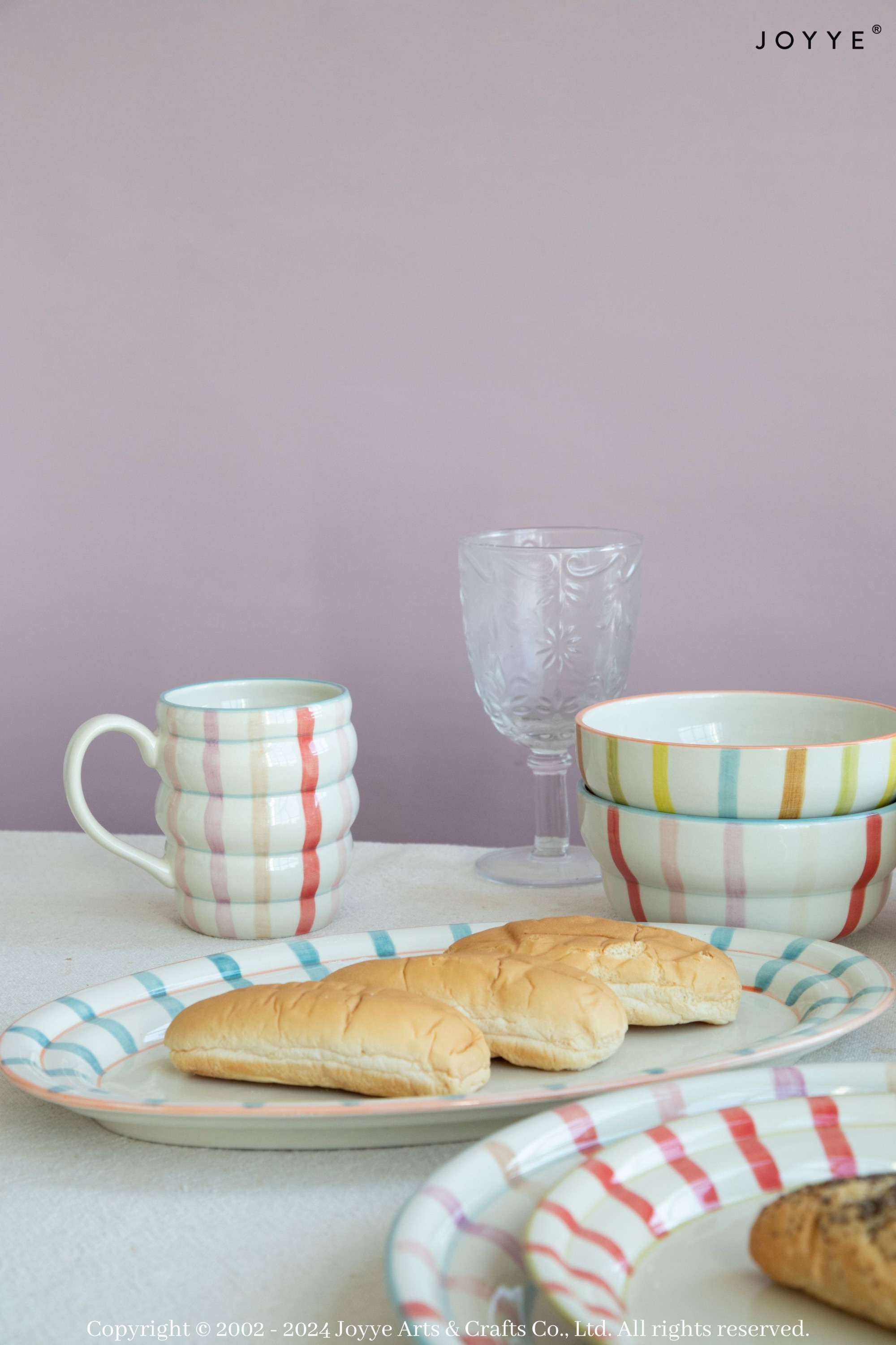 Getting inspired by the summertime, when stripes in different vibrant tones are applied to the mugs, which are shaped like stacked swimming rings, it look like flowing flags on the waves. This collection looks simple but cute.