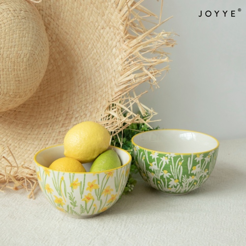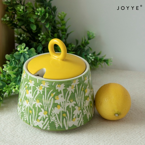 Decal in bright yellow florals with a green backdrop on ceramic tableware, it delivers an intense fresh vibe and is perfect for a garden party tablescape. Set up a casual and refreshing high tea in such vibrant summer!