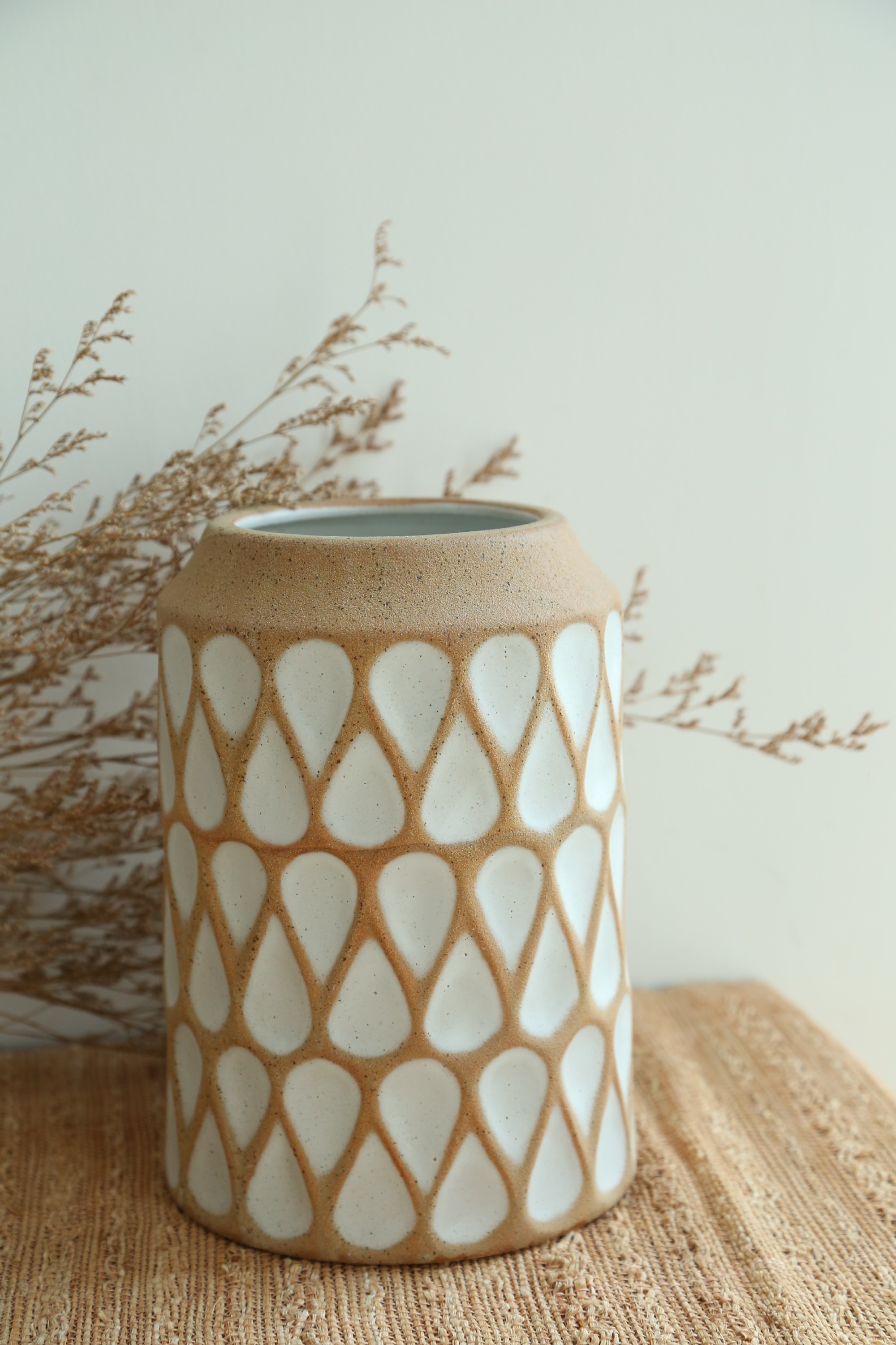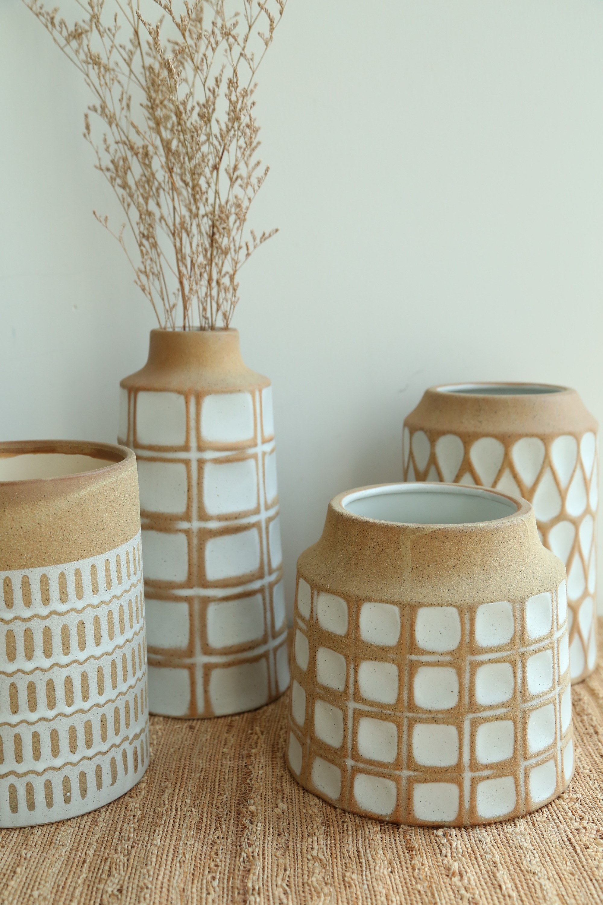 The simple geometric patterns of the planters are glazed with white color, with exposed sand designs of the whole shape. It has a beautiful color combination that brings a touch of warmth to all rooms.