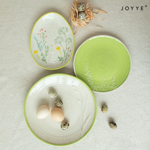 The dinnerware reflects this intricate and creative process. The gentle embossing, balanced forms, and interplay of matte and glossy finishes make them unique objects with a strong identity. Their genius lies in their enchanting design, making The Green and White Embossed Bunnies Collection let your festive meals shine.