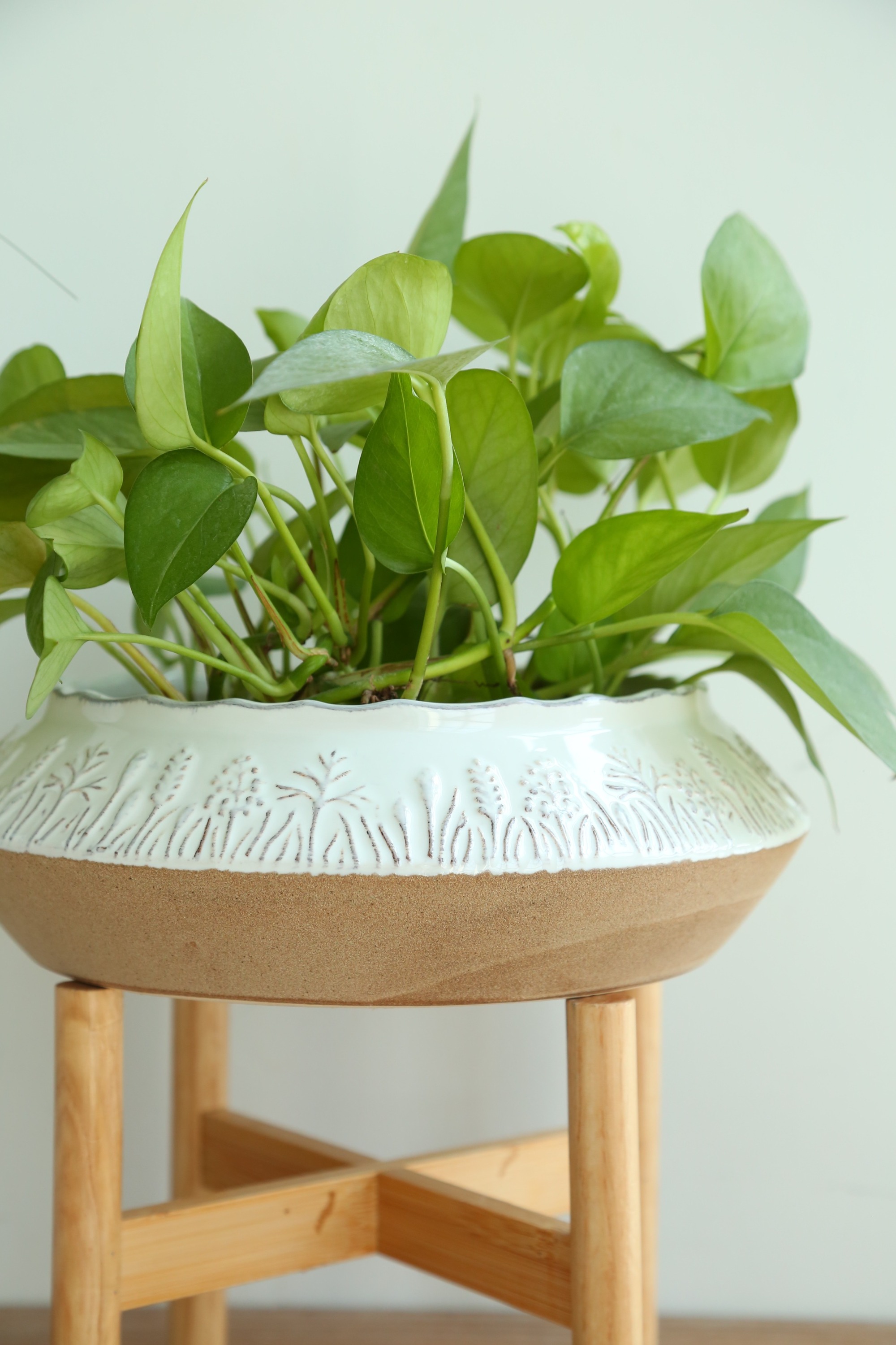 Embossed with wheat patterns in milky-colored stoneware, the set of Harvest Planters has a wave shape edge, which makes it looks more natural. Noted the special one in soft green, this unique planter is made in crackle glaze.