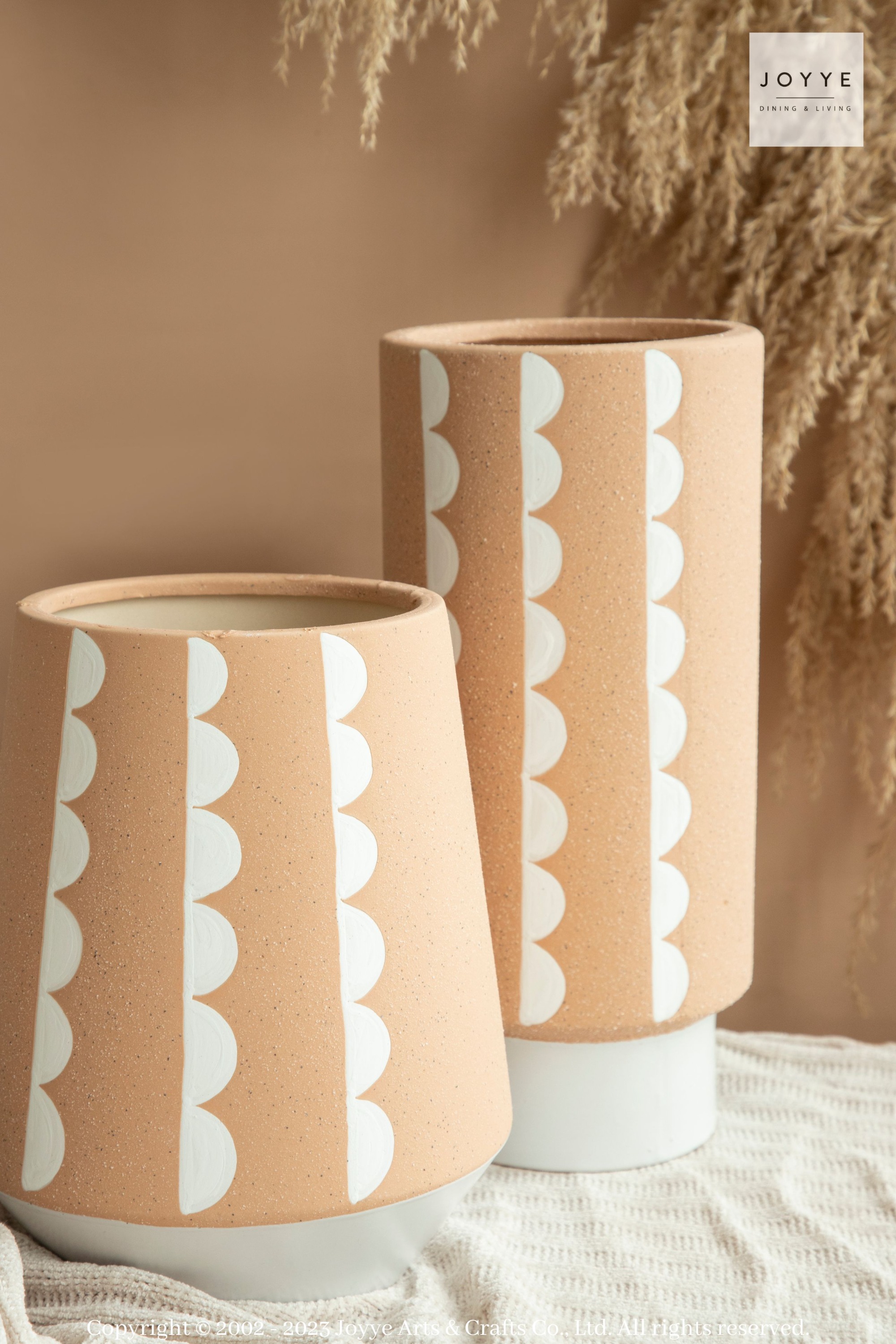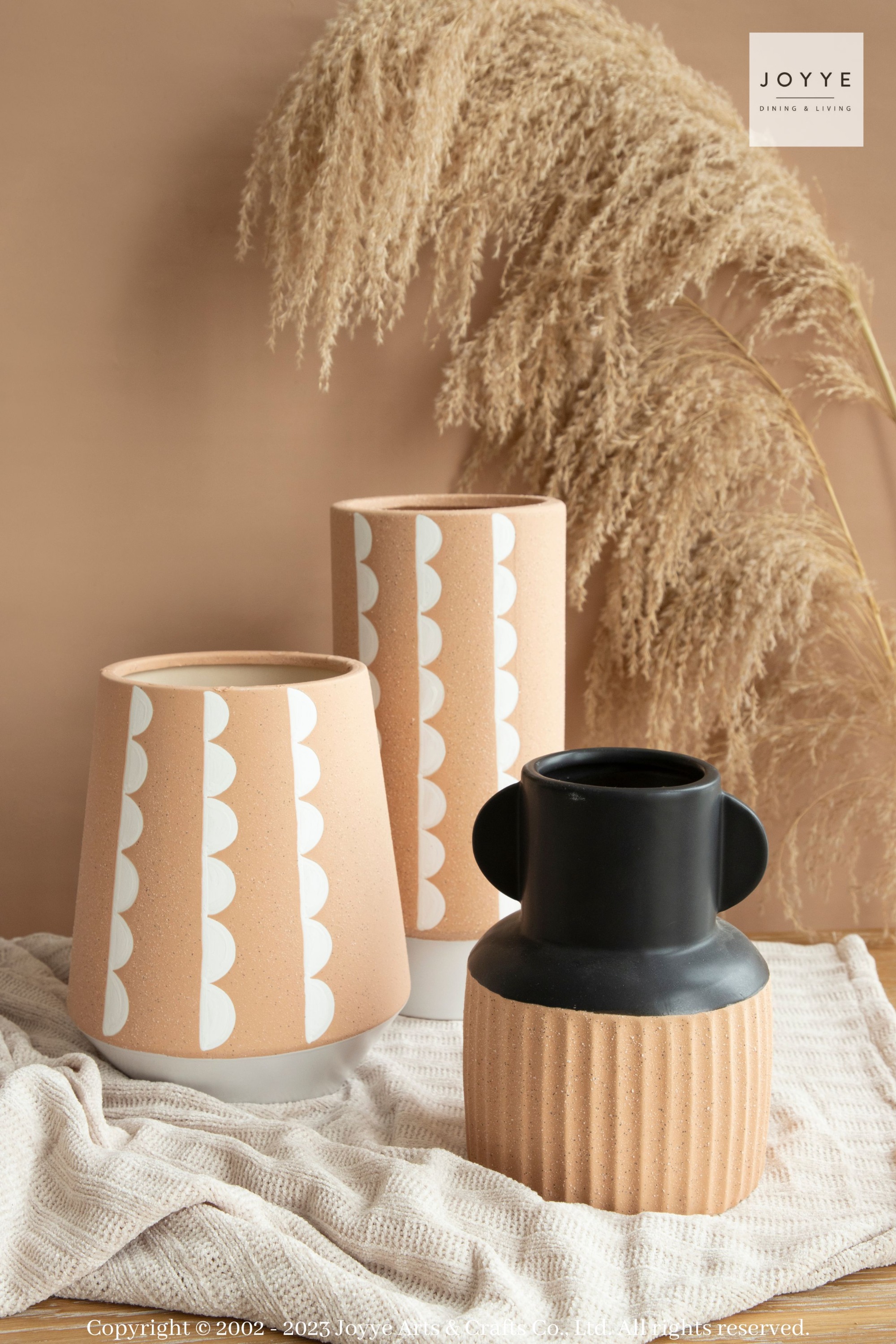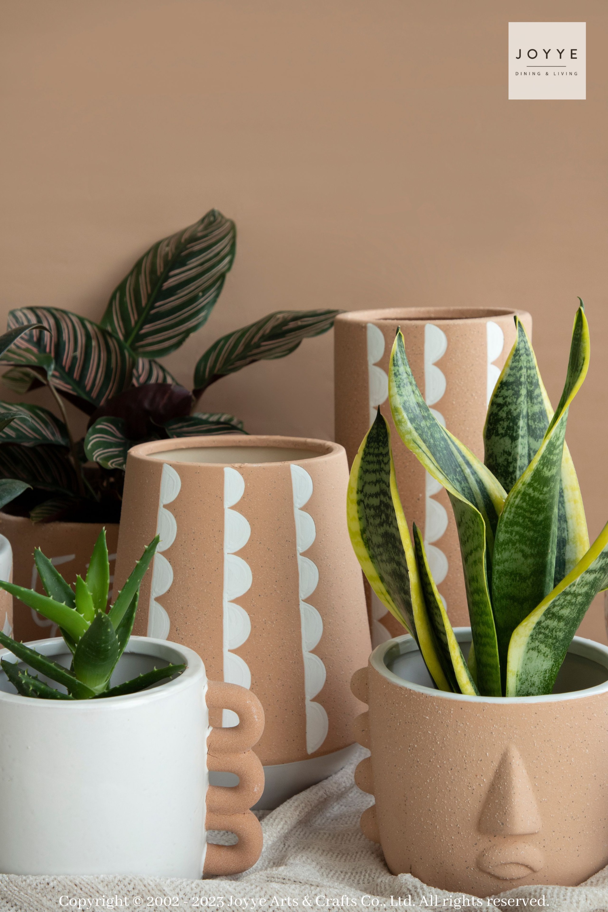 When artistry combines with fun, it expresses a new playful style. This set vase and planter collection focus on details, striped three-dimensional bottoms, half-circle tiny handles, and embossed facial features for the planter surface. Not much weird sense but is more artistic.