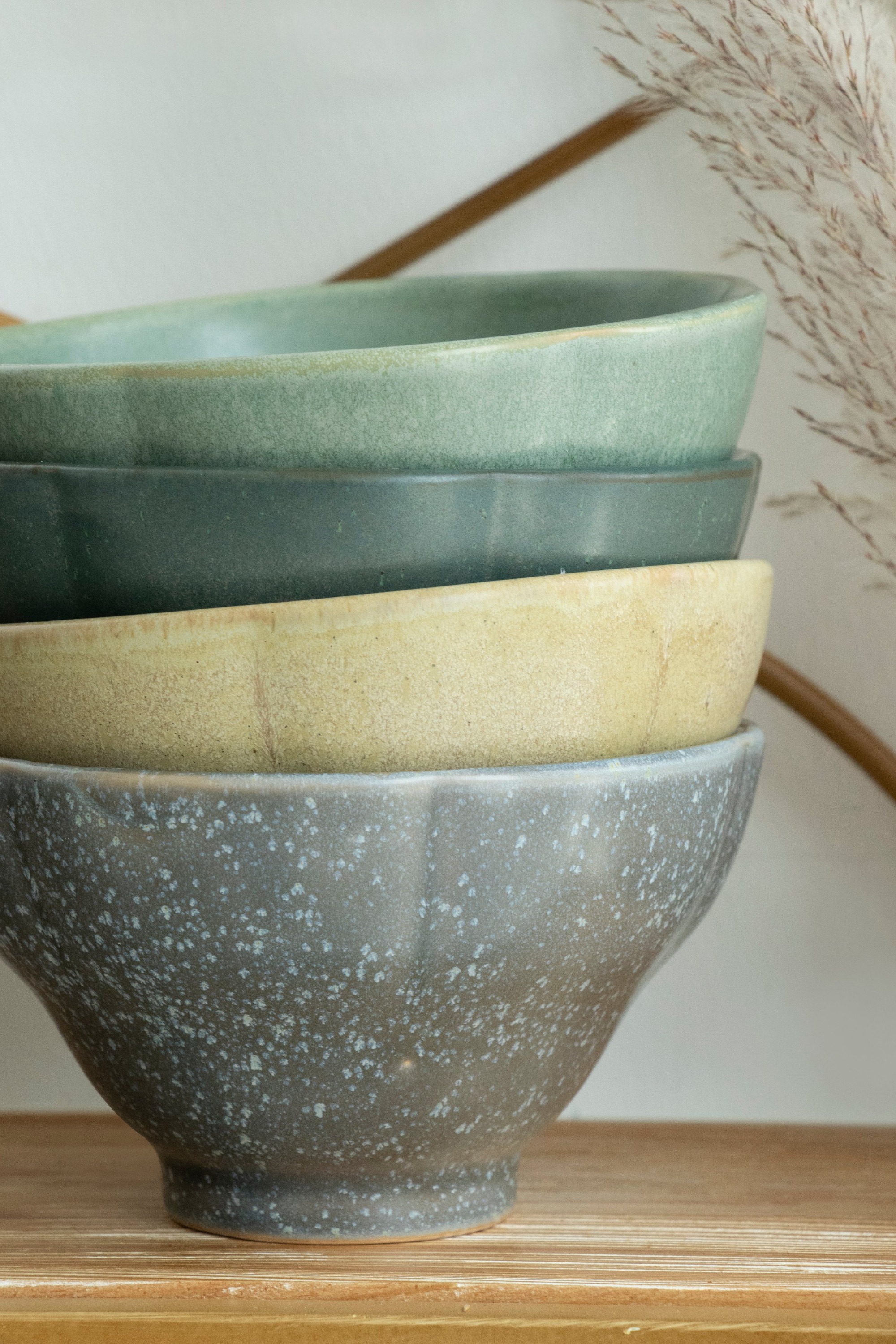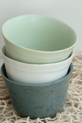 A combination of soft grey tones with a speckled design is perfect for spring table decoration. The Pale Tableware Collection matches green, blue, yellow, and grey in a light tone, making a slow lifestyle statement on any table setting.