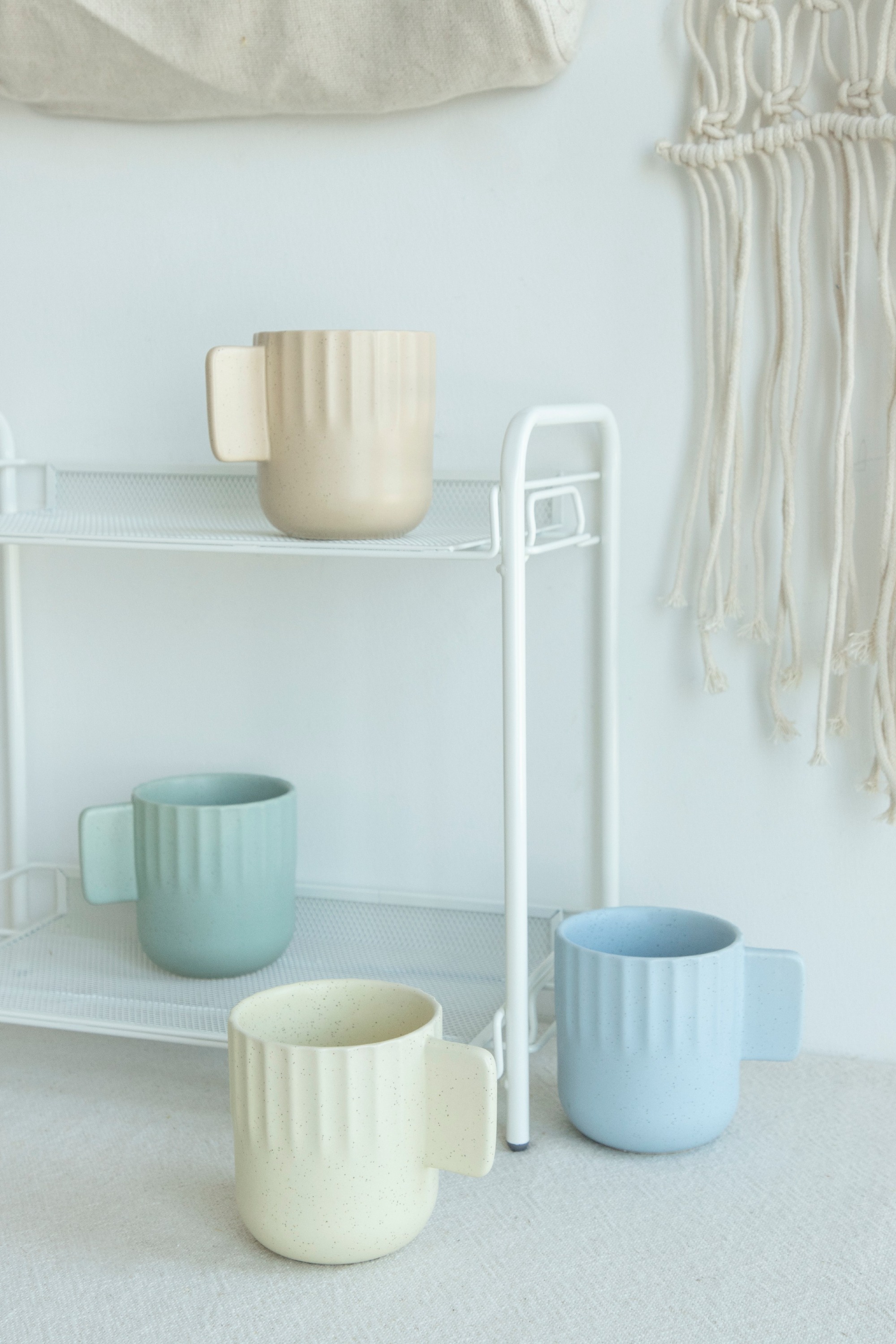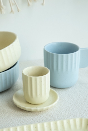 Simple and clean lines deliver us a pure expression. Getting inspired by this, a lightly debossed stripe design matches with a rectangle solid handle. A whole set of mugs in the soft speckled glaze will be your new must-have this spring.