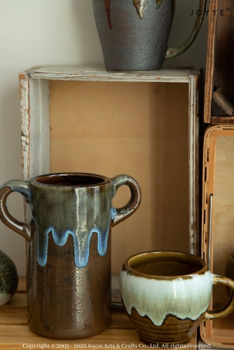 Taking an exploring trip of retro Asian style. Various mugs are finished with speckles, hanging reactive glaze, or only matte glaze: little larger mug shapes plus dark hues.