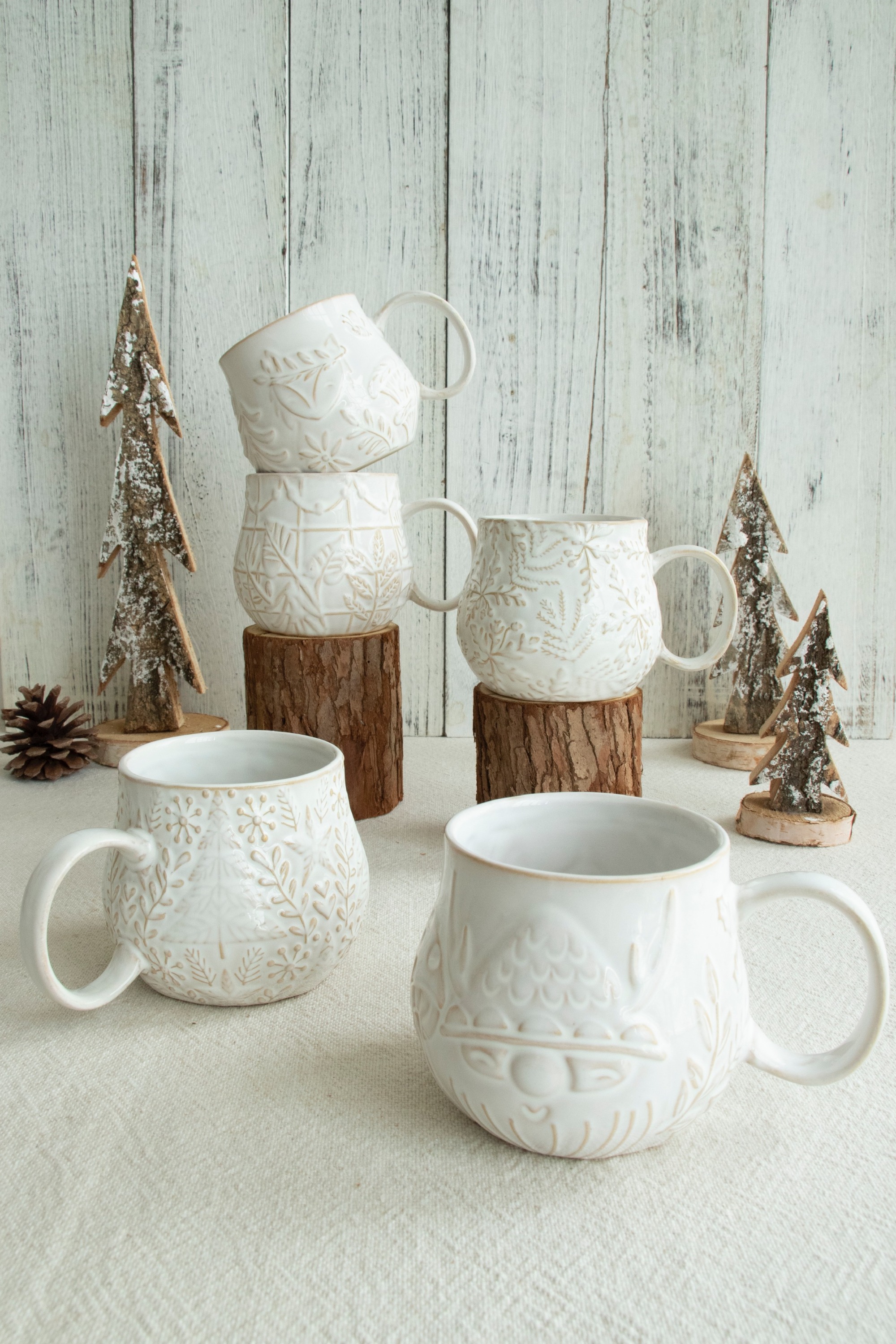 Embossed with snow, Christmas tree leaves patterns, the Snow Man Mug Collection is made of strong stoneware in soft white glaze. The round mug body also brings us a soft touch, providing a warm vibe this Christmas. Various shapes and patterns are availabl