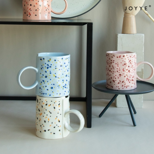 Terrazzo-like designs create a vivid display of speckled color for these mugs. It is visually attractive and versatile. Glazed in soft blue and soft orange tones, it is a perfect collection for the spring-summer time.