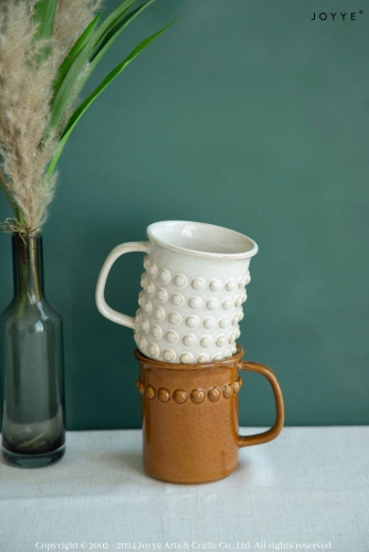 Grace is Timeless. Elevate your table decor to new heights of sophistication with our exquisite ceramic tableware. Embossed dots and a shiny reactive glaze accompany the captivating blend of amber and white tones.